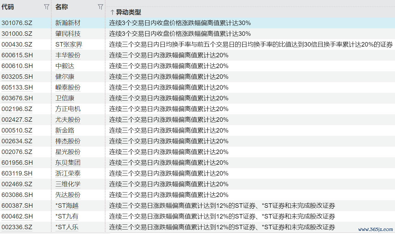 截至4月25日证券配资公司,近日A股有20只个股连续异动2个交易日及以上。金力泰、汉嘉设计、北鼎股份连续3个交易日内收盘价格涨跌幅偏离值累计达30%。西昌电力、宁波联合、国中水务等连续三个交易日内涨跌幅偏离值累计达20%。ST华鹏、*ST同洲、*ST信通等连续三个交易日涨跌幅偏离值累计达到12%。