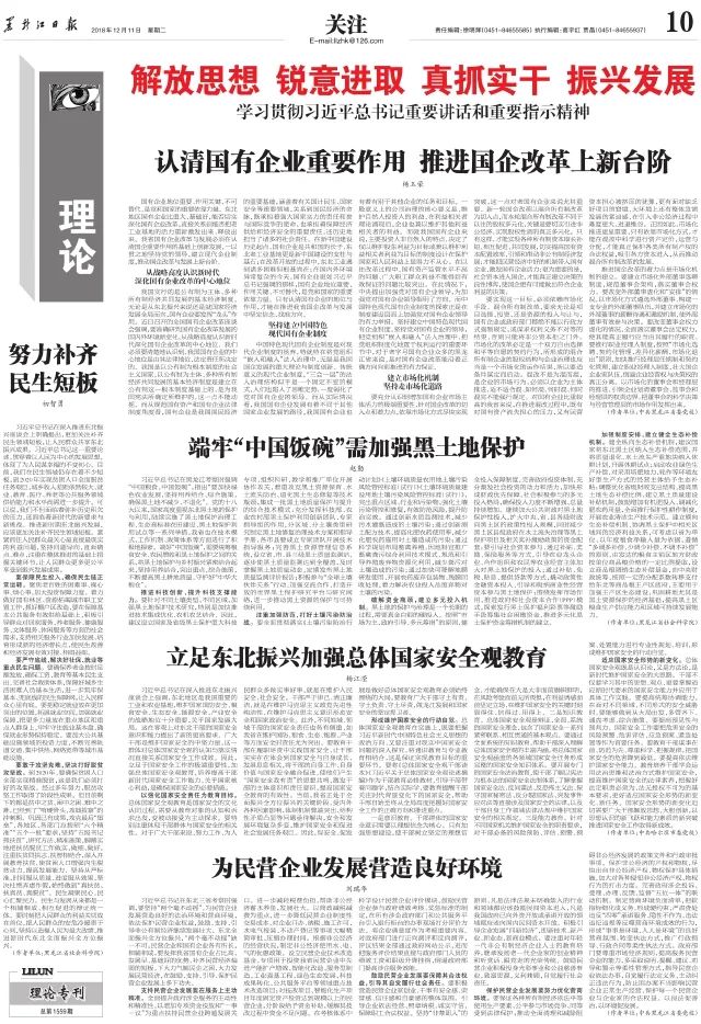 ]article_adlist-->黑龙江省国有企业改革与发展必须在认清国企重要作用的基础上创新发展,一以贯之地坚持党的领导,建立现代企业制度,推动国企改革与发展上新台阶。